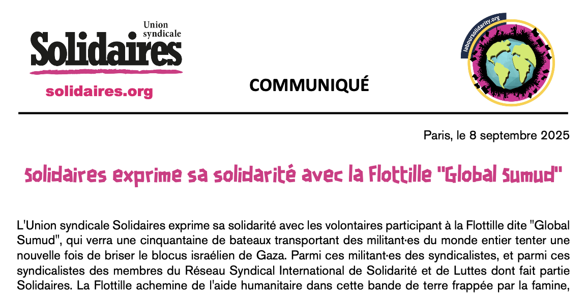 L'Union syndicale Solidaires exprime sa solidarité avec les volontaires participant à la Flottille dite "Global Sumud", qui verra une cinquantaine de bateaux transportant des militant·es du monde entier tenter une nouvelle fois de briser le blocus israélien de Gaza. Parmi ces militant·es des syndicalistes, et parmi ces syndicalistes des membres du Réseau Syndical International de Solidarité et de Luttes dont fait partie Solidaires. La Flottille achemine de l'aide humanitaire dans cette bande de terre frappée par la famine, notamment des aliments pour bébés, des fournitures médicales, des denrées alimentaires, et des unités de dessalement d'eau pour les personnes assiégées à Gaza.