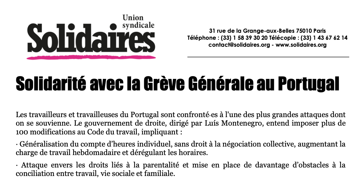 Nous exprimons notre solidarité avec les travailleurs et travailleuses du Portugal qui résistent à cette attaque contre leurs droits, y compris le droit à l’organisation collective sur le lieu de travail.