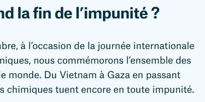 Aujourd’hui et comme chaque 30 novembre, à l’occasion de la journée internationale du souvenir des victimes de guerres chimiques, nous commémorons l’ensemble des victimes des armes chimiques à travers le monde. Du Vietnam à Gaza en passant par la Syrie, le Rif ou l’Ukraine : les armes chimiques tuent encore en toute impunité.