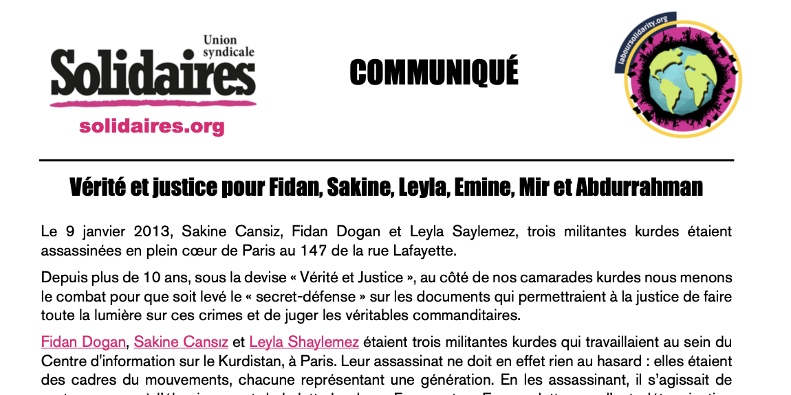 Depuis plus de 10 ans, sous la devise « Vérité et Justice », au côté de nos camarades kurdes nous menons le combat pour que soit levé le « secret-défense » sur les documents qui permettraient à la justice de faire toute la lumière sur ces crimes et de juger les véritables commanditaires.