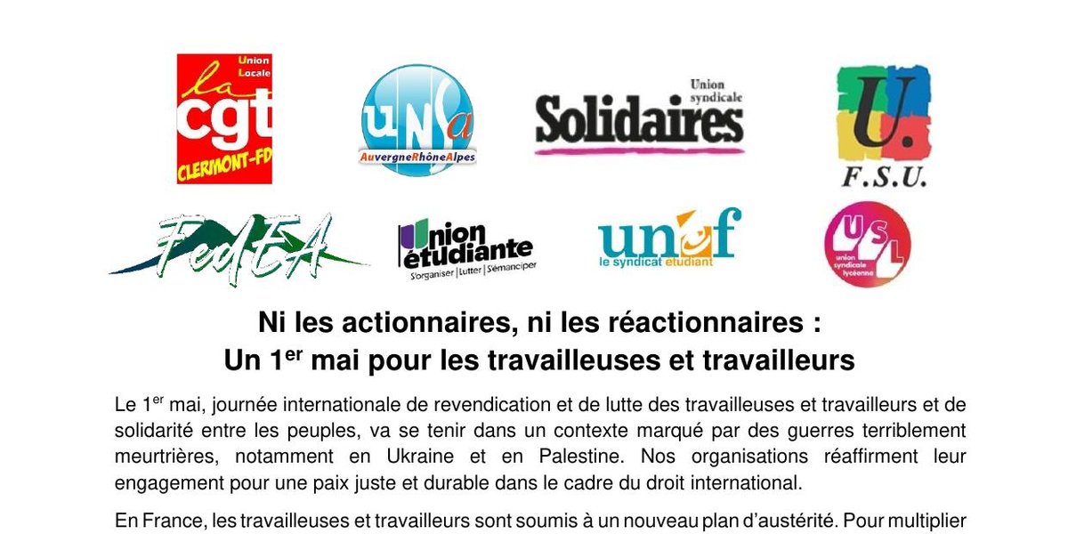 Appel intersyndical au 1er Mai 2024 à Clermont-Ferrand CGT-Unsa-Solidaires-FSU-FedeA-Union Étudiante-UNEF-USL.