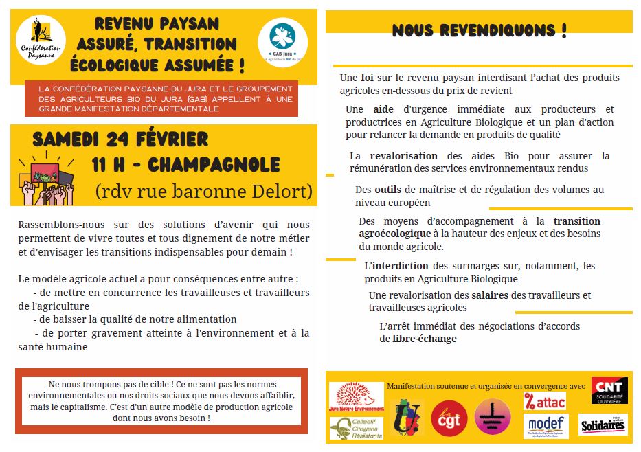 Plusieurs centaines de personnes ont défilé dans les rues de Champagnole à l’appel de la Confédération paysanne et du GAB 39, co signé par Attac, JNE, CCR, MODEF, Soulèvement de la terre, CNT, CNT-SO, CGT, FSU et Solidaires .
