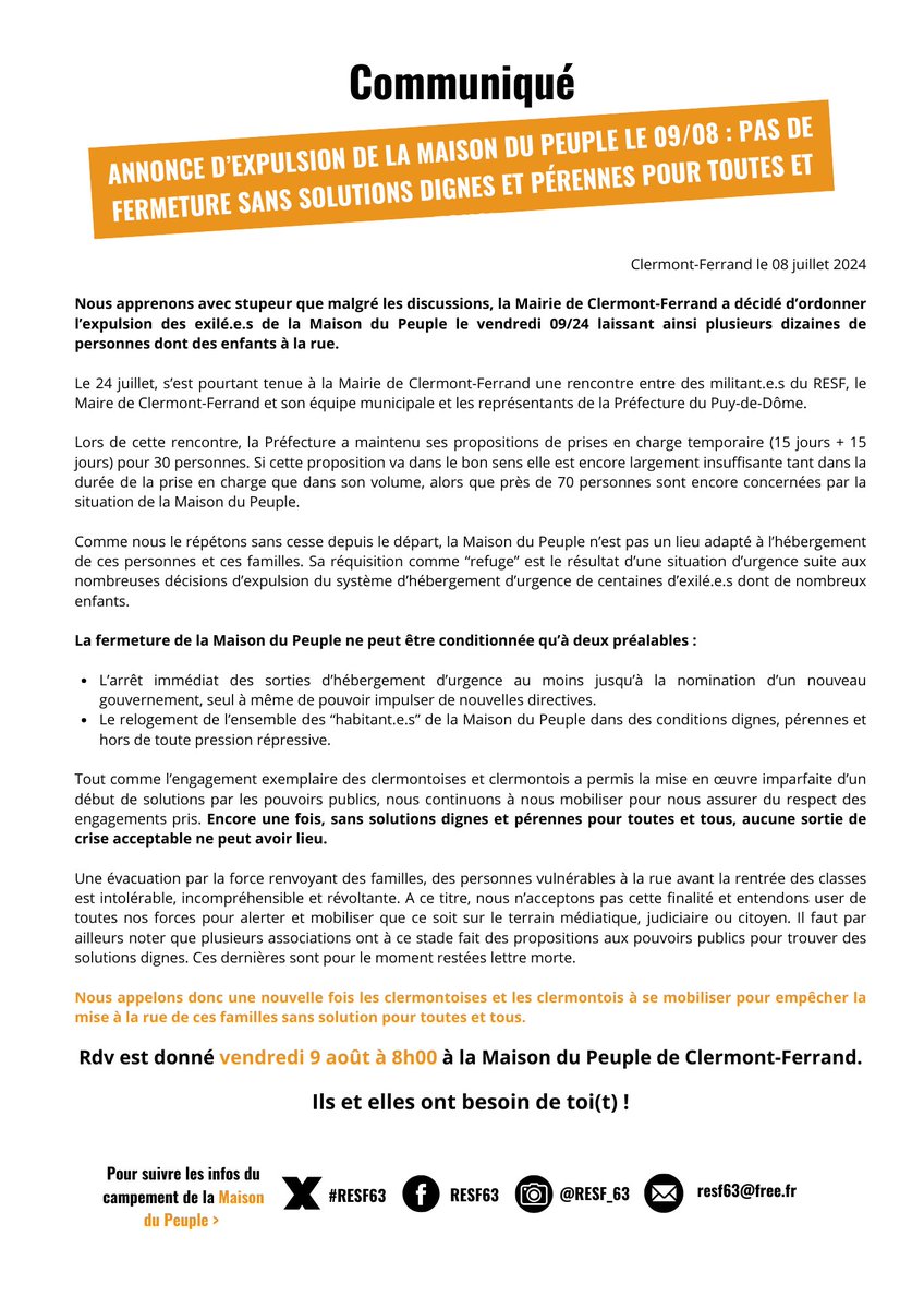 Nous apprenons avec stupeur que malgré les discussions, la Mairie de Clermont-Ferrand a décidé d'ordonner l’expulsion des exilé.e.s de la Maison du Peuple le vendredi 09/24 laissant ainsi plusieurs dizaines de personnes dont des enfants à la rue.