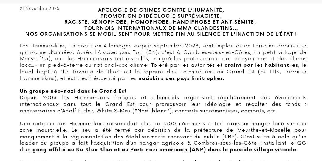 Les Hammerskins, interdits en Allemagne depuis septembre 2023, sont implantés en Lorraine depuis une quinzaine d’années. Après l'Alsace, puis Toul (54), c'est à Combres-sous-les-Côtes, un petit village de Meuse (55), que les Hammerskins ont installés, malgré les protestations des citoyen⋅nes et des élu⋅es locaux un pied-à-terre du national-socialisme. Toléré par les autorités et craint par les habitant⋅es, le local baptisé “La Taverne de Thor” est le repaire des Hammerskins du Grand Est (ou LHS, Lorraine Hammerskins), et est très fréquenté par les naziskins des pays limitrophes. Un groupe néo-nazi dans le Grand Est Depuis 2003 les Hammerskins français et allemands organisent régulièrement des événements internationaux dans tout le Grand Est pour promouvoir leur idéologie et récolter des fonds : anniversaires d’Adolf Hitler, White X-Mas ("Noël blanc"), concerts suprémacistes, combats, etc Une antenne des Hammerskins rassemblait plus de 1500 néo-nazis à Toul dans un hangar loué sur une zone industrielle. Le lieu a été fermé par décision de la préfecture de Meurthe-et-Moselle pour manquement à la réglementation des établissements recevant du public (ERP). C'est suite à cela qu'un leader du groupe a fait l’acquisition d’un hangar agricole à Combres-sous-les-Côte, installant le QG d’un gang affilié au Ku Klux Klan et au Parti nazi américain (ANP) dans le paisible village viticole. Ce réseau international est aujourd’hui considéré comme la plus grande et plus dangereuse structure néonazie. Ce groupe terroriste, impliqué dans de nombreux meurtres et attentats racistes, est le plus structuré au niveau international et développe ses activités dans l’anonymat. Son idéologie raciste et néonazie est mise en pratique par la violence organisée envers leurs ennemi⋅es politiques et sociaux, allant jusqu’aux assassinats. Il n’est pas seulement question de l'image que renvoie la région en accueillant de tels rassemblements dans un secteur touristique comme celui de Combres-sous-les-Côtes, situé à proximité du site des Éparges, champs de bataille de la Grande Guerre. Il est question de sécurité et d’ordre public face à la dangerosité d’individus suprémacistes, racistes, homophobes, xénophobes, handiphobes et antisémites ultra-violents organisés et entraînés aux combats. Nous alertons sur la nécessité d’une veille collective face à l´implantation de ces groupes néo-nazis ultra-violents et à l’endoctrinement des jeunes par le sport. Face à de telles organisations et à l’inaction des pouvoirs publics, nous ne pouvons laisser nos élu⋅es locaux seul⋅es. Nos organisations demandent donc à l’État d'agir dans les plus brefs délais pour la fermeture administrative définitive de l’établissement dit « La Taverne de Thor ». Dans ce but, nous appelons tous les citoyens et citoyennes, y compris les élu·es des collectivités locales à participer à un rassemblement devant la préfecture de Bar-le-Duc (55) le 29/11/2025 à 11h