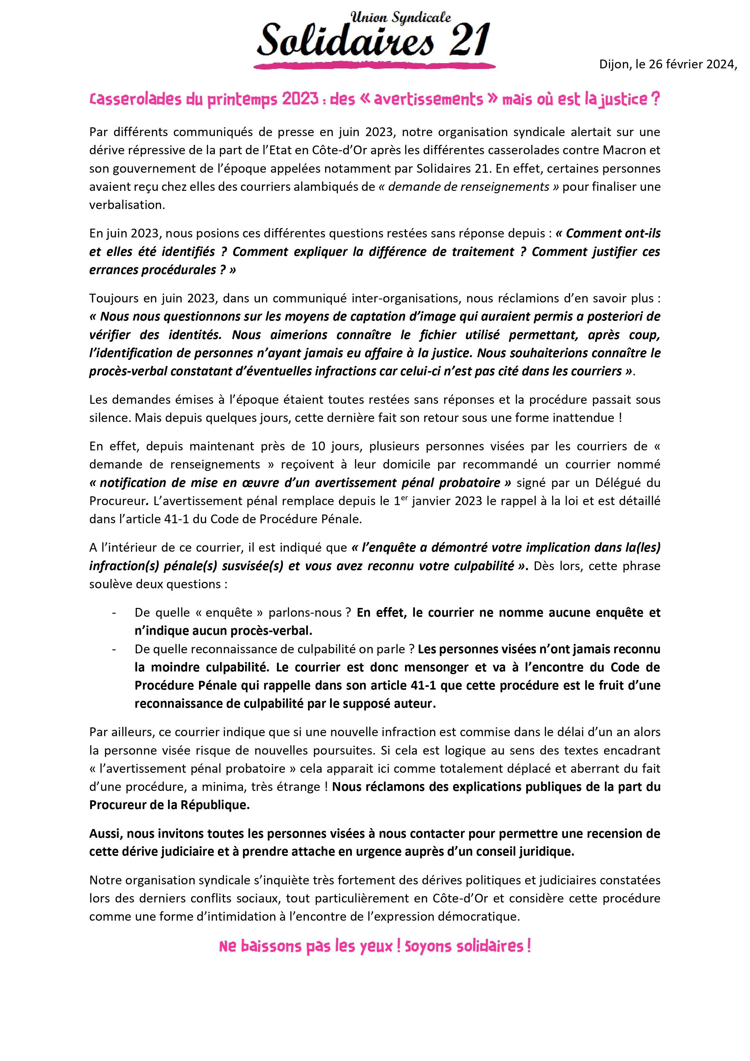 Par différents communiqués de presse en juin 2023, notre organisation syndicale alertait sur une dérive répressive de la part de l’Etat en Côte-d’Or après les différentes casserolades contre Macron et son gouvernement de l’époque appelées notamment par Solidaires 21. En effet, certaines personnes avaient reçu chez elles des courriers alambiqués de « demande de renseignements » pour finaliser une verbalisation.