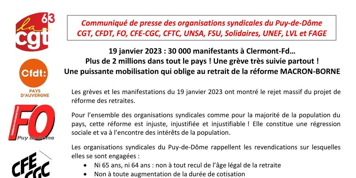 Dans le cadre de la déclaration intersyndicale nationale du 19 janvier, les organisations syndicales du Puy-de-Dôme décident de tenir une conférence de presse publique lundi 23 janvier 2023, jour de la présentation du projet de loi au conseil des ministres, à 18 heures devant la Préfecture du Puy-de-Dôme.