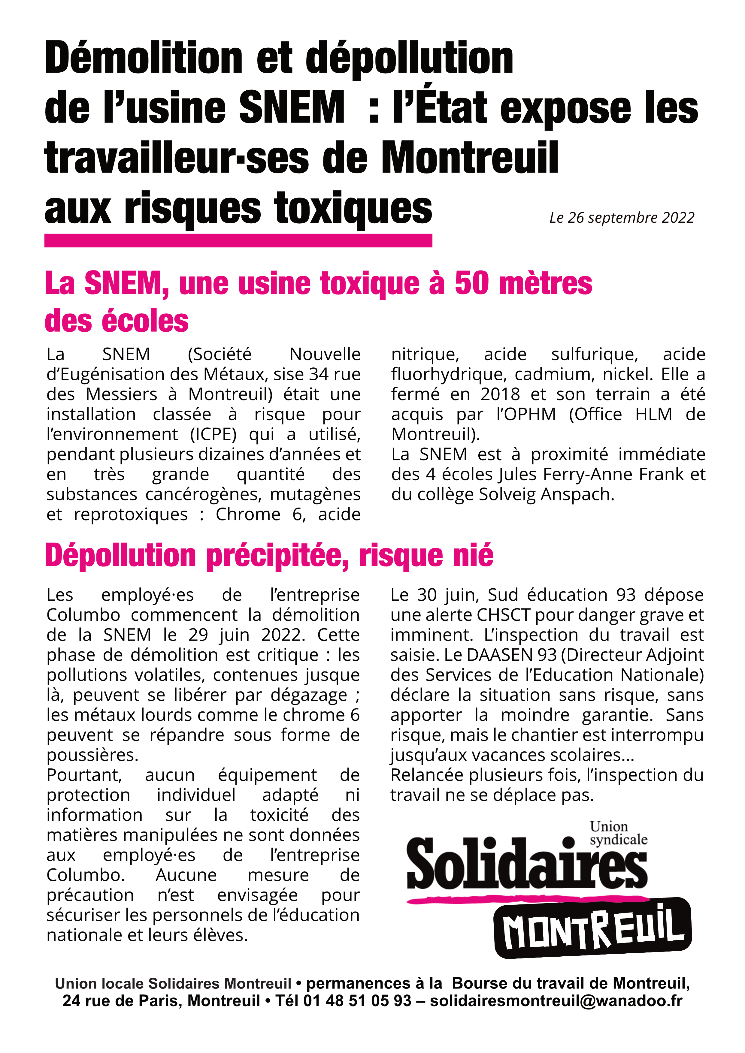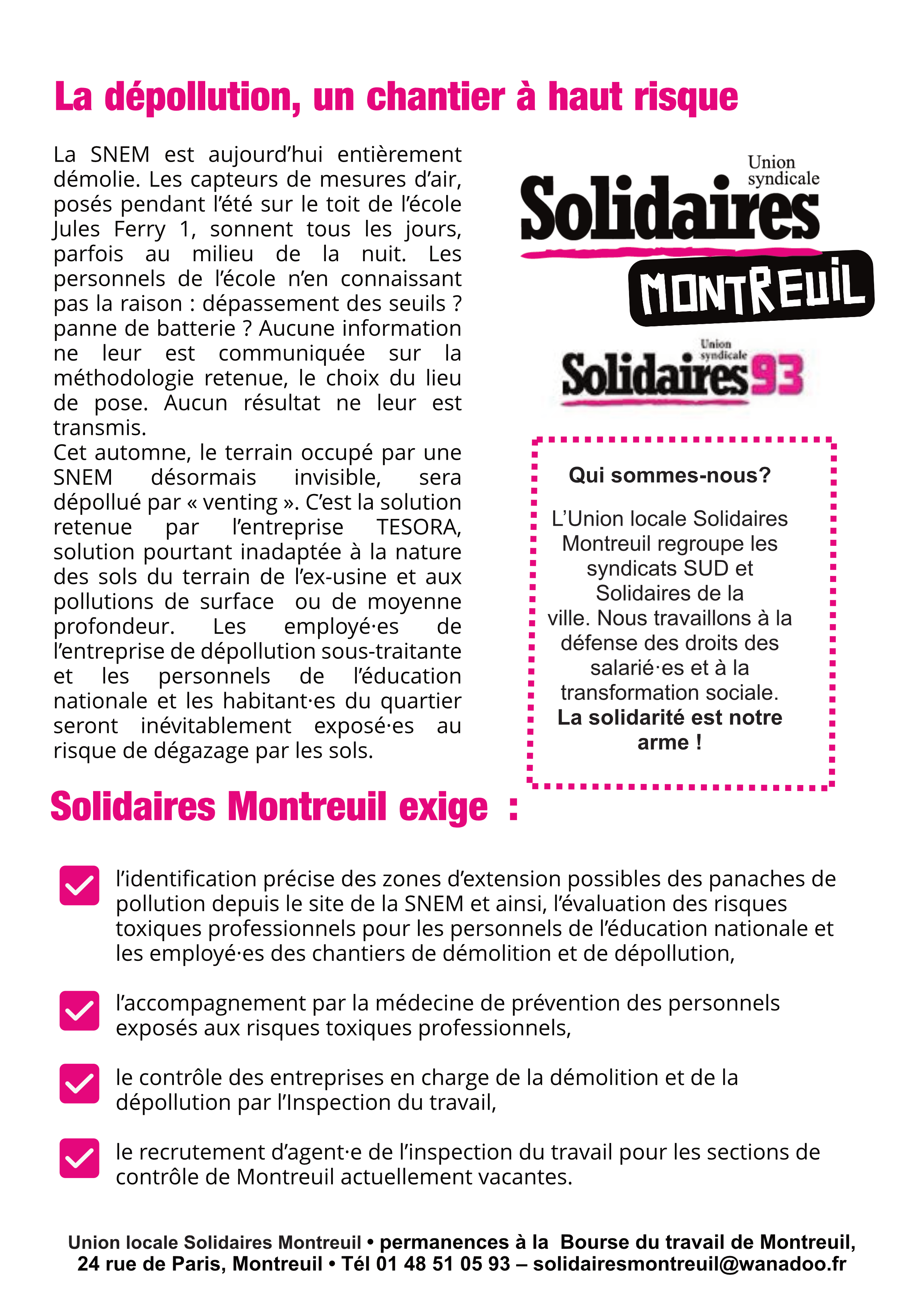 Union locale Solidaires Montreuil • permanences à la Bourse du travail de Montreuil, 24 rue de Paris, Montreuil • Tél 01 48 51 05 93 – solidairesmontreuil@wanadoo.fr