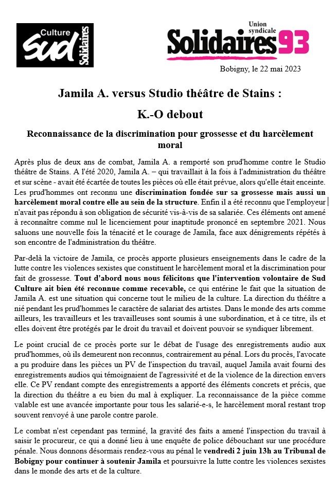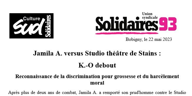 Après plus de deux ans de combat, Jamila A. a remporté son prud’homme contre le Studio théâtre de Stains. A l’été 2020, Jamila A. – qui travaillait à la fois à l’administration du théâtre et sur scène – avait été écartée de toutes les pièces où elle était prévue, alors qu’elle était enceinte. Les prud’hommes ont reconnu une discrimination fondée sur sa grossesse mais aussi un harcèlement moral contre elle au sein de la structure. Enfin il a été reconnu que l’employeur n’avait pas répondu à son obligation de sécurité vis-à-vis de sa salariée. Ces éléments ont amené à reconnaître comme nul le licenciement pour inaptitude prononcé en septembre 2021. Nous saluons une nouvelle fois la ténacité et le courage de Jamila, face aux dénigrements répétés à son encontre de l’administration du théâtre.