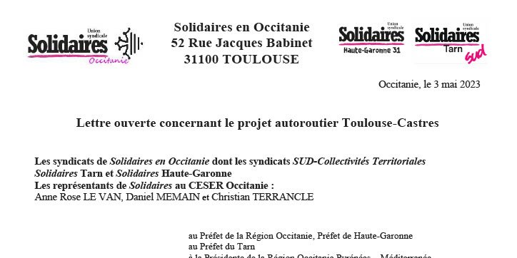 Les représentant-es de Solidaires au CESER Occitanie et les syndicats de Solidaires en Occitanie, dont les syndicats SUD-Collectivités Territoriales, directement impliqués dès lors que les collectivités locales sont co-financeurs de ce projet, souhaitent vous interpeller sur le projet inique d’autoroute A69 entre Toulouse et Castres qui fait l’objet d’une contestation majeure.