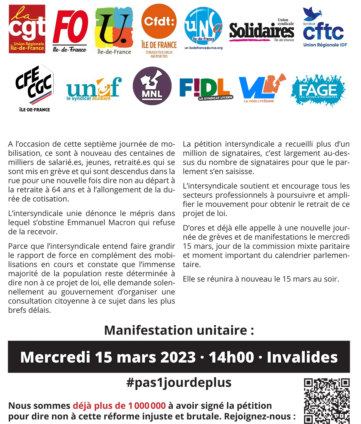 L’intersyndicale soutient et encourage tous les secteurs professionnels à poursuivre et amplifier le mouvement pour obtenir le retrait de ce projet de loi.