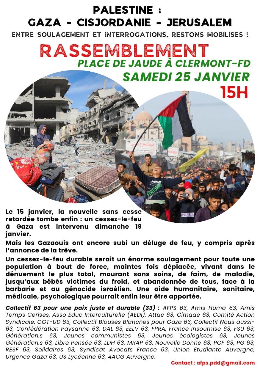 Le Collectif 63 pour une paix juste et durable, mobilisé depuis 15 mois, se félicite de ce premier pas, il n’est pas que le fruit de tractations politiques mais aussi celui de la mobilisation de tous les défenseurs des droits des peuples, des droits humains, du droit international dans le monde entier, qui ont manifesté sans relâche pour que s’arrête le génocide, reconnu par les instances internationales et de nombreuses ONG, dont Amnesty International.