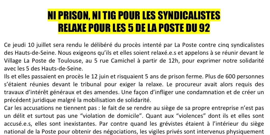 Si le grief de « violation de domicile professionnel » était retenu cela serait un précédent grave pour les postiers et les postières mais en réalité pour l’ensemble du monde du travail. Se rendre au siège de sa propre entreprise n’est pas un délit et surtout pas une « violation de domicile », faire grève n’est pas un crime, défendre les intérêts des salariés ne doit pas conduire sur les bancs des tribunaux et encore moins en prison.