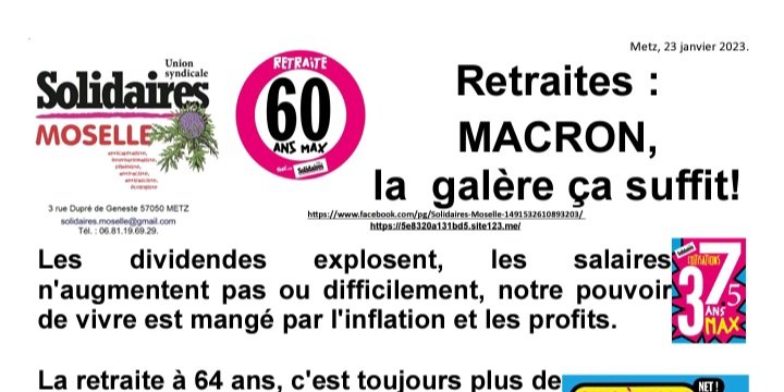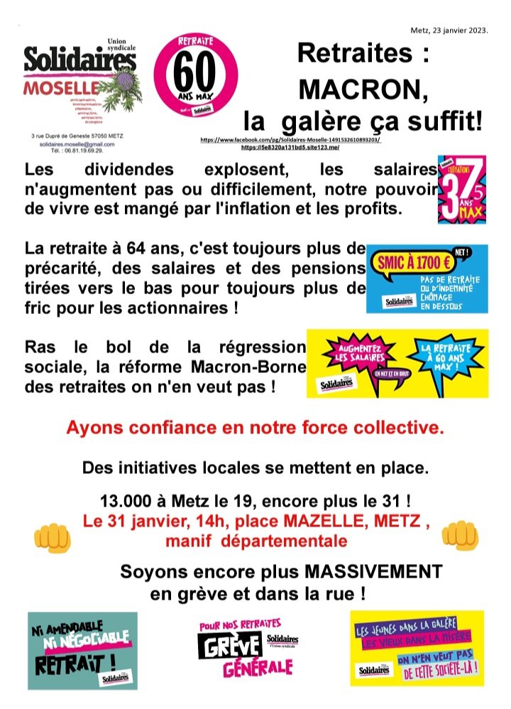 Liens sur le côté vers les appels Solidaires Moselle et intersyndical à être en grève et manifester massivement le 31 janvier 14h place Mazelle et à une marche nocturne à Metz le 27 janvier à 18h place St Louis.