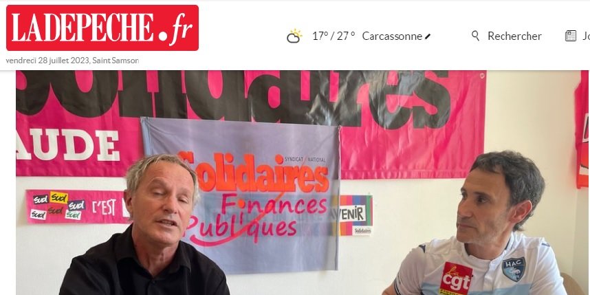 Un article de La Dépêche du vendredi 28 juillet 2023 est consacré à l’intersyndicale SOLIDAIRES-FO-CGT des Finances publiques de l’Aude qui remet en cause la nouvelle plateforme numérique "Gérer mes biens immobiliers" destinée à la déclaration en ligne des biens immobiliers et de leurs occupants.