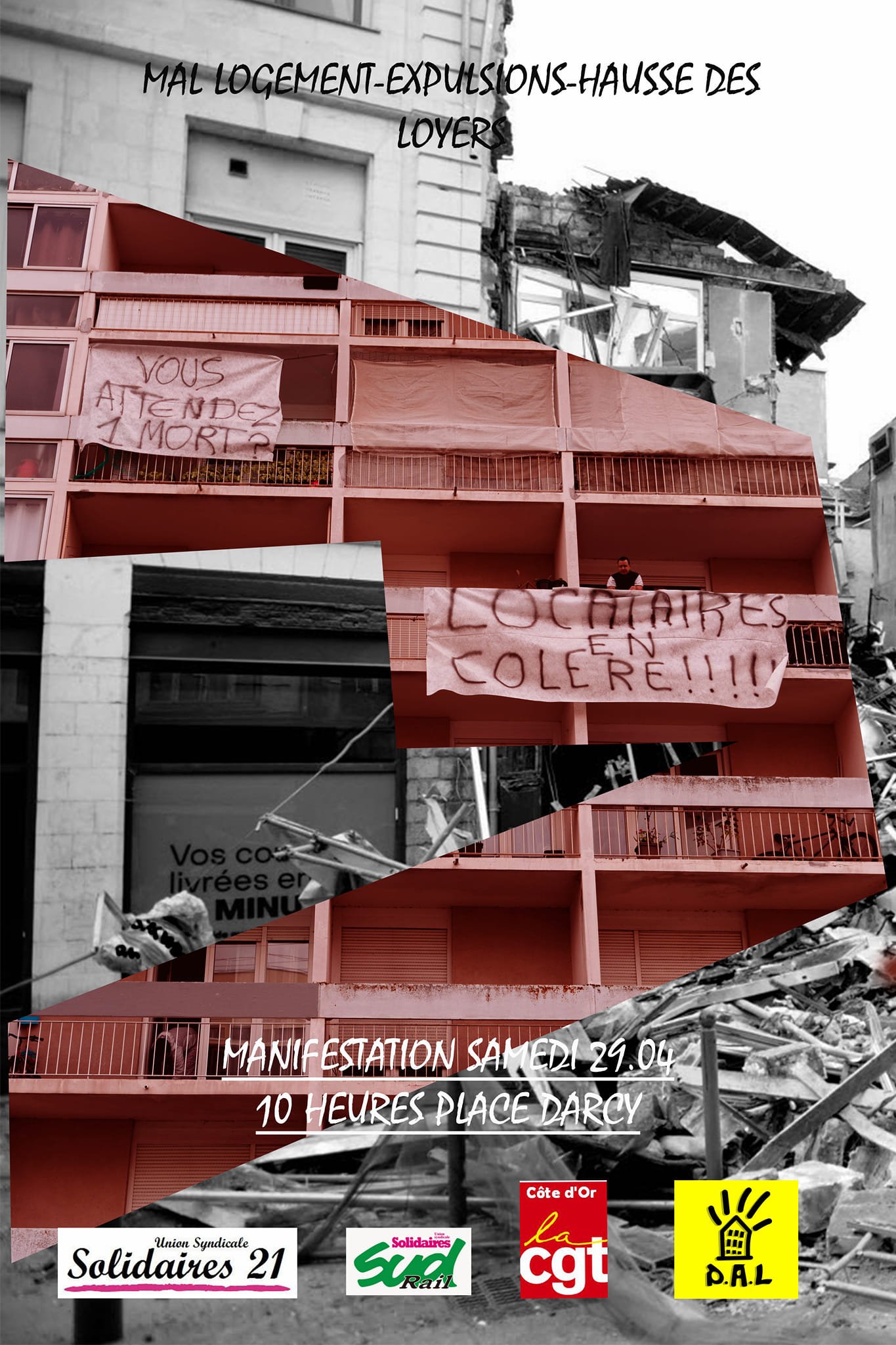 Pour faire entendre les revendications des locataires des " Violettes " et du " Lac " pour visibiliser les problèmes de mal logement et pour exiger les réquisitions de logements vides nous organisons un rassemblement le 29 AVRIL 2023 à 10 HEURES PLACE DARCY A DIJON !