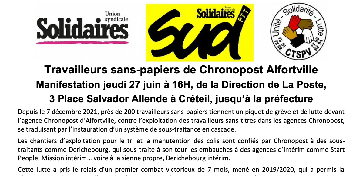 Depuis le 7 décembre 2021, près de 200 travailleurs sans-papiers tiennent un piquet de grève et de lutte devant l’agence Chronopost d’Alfortville, contre l’exploitation des travailleurs sans-titres dans les agences Chronopost, se traduisant par l’instauration d’un système de sous-traitance en cascade.