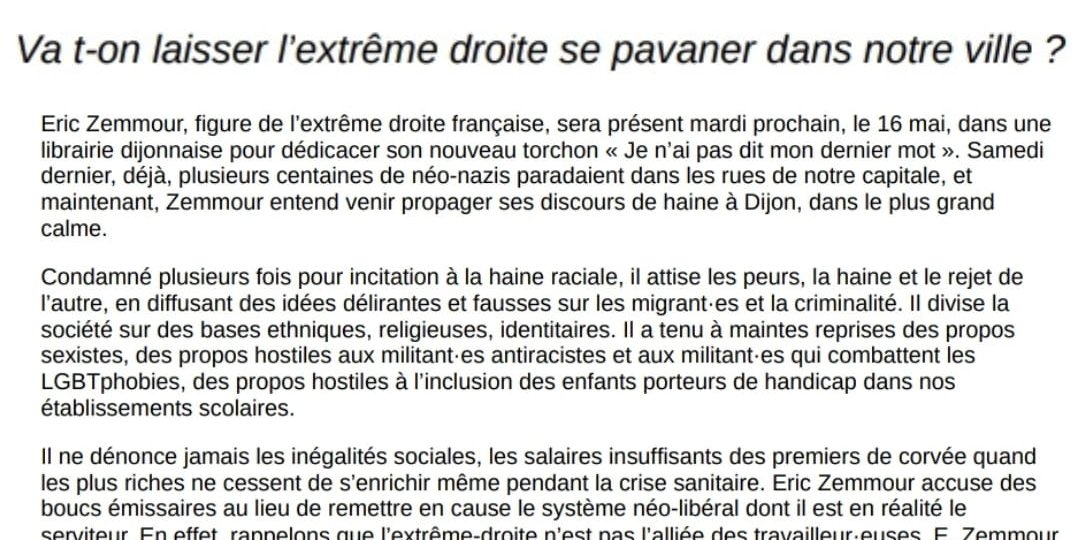 Eric Zemmour, figure de l’extrême droite française, sera présent mardi prochain, le 16 mai, dans une librairie dijonnaise pour dédicacer son nouveau torchon « Je n’ai pas dit mon dernier mot ». Samedi dernier, déjà, plusieurs centaines de néo-nazis paradaient dans les rues de notre capitale, et maintenant, Zemmour entend venir propager ses discours de haine à Dijon, dans le plus grand calme.