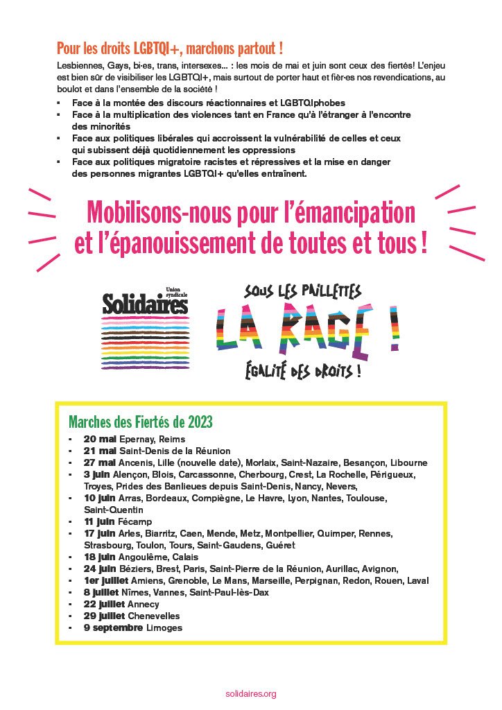 - 3 juin Alençon, Blois, Carcassonne, Cherbourg, Crest, La Rochelle, Périgueux, Troyes, Prides des Banlieues depuis Saint-Denis, Nancy, Nevers,