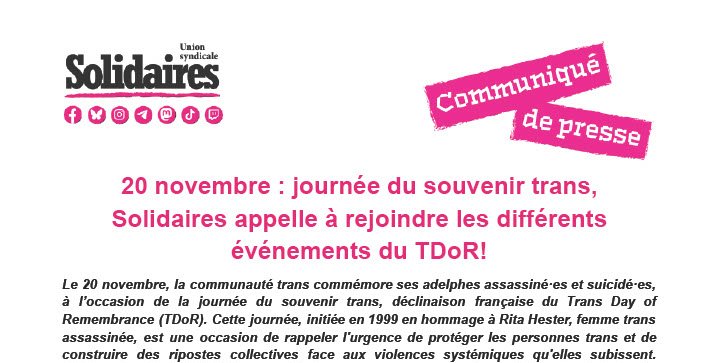 Le 20 novembre, la communauté trans commémore ses adelphes assassiné·es et suicidé·es, à l’occasion de la journée du souvenir trans, déclinaison française du Trans Day of Remembrance (TDoR). Cette journée, initiée en 1999 en hommage à Rita Hester, femme trans assassinée, est une occasion de rappeler l'urgence de protéger les personnes trans et de construire des ripostes collectives face aux violences systémiques qu'elles subissent. L’Union Syndicale Solidaires appelle les personnes trans et leurs allié·es à rejoindre les mobilisations organisées partout en France.