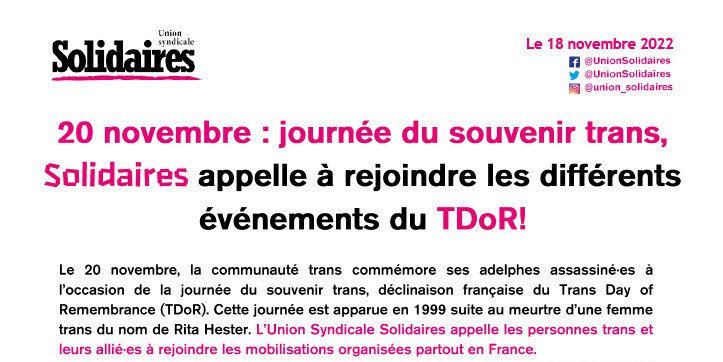 Le 20 novembre, la communauté trans commémore ses adelphes assassiné·es à l’occasion de la journée du souvenir trans, déclinaison française du Trans Day of Remembrance (TDoR). Cette journée est apparue en 1999 suite au meurtre d’une femme trans du nom de Rita Hester. L’Union Syndicale Solidaires appelle les personnes trans et leurs allié·es à rejoindre les mobilisations organisées partout en France.