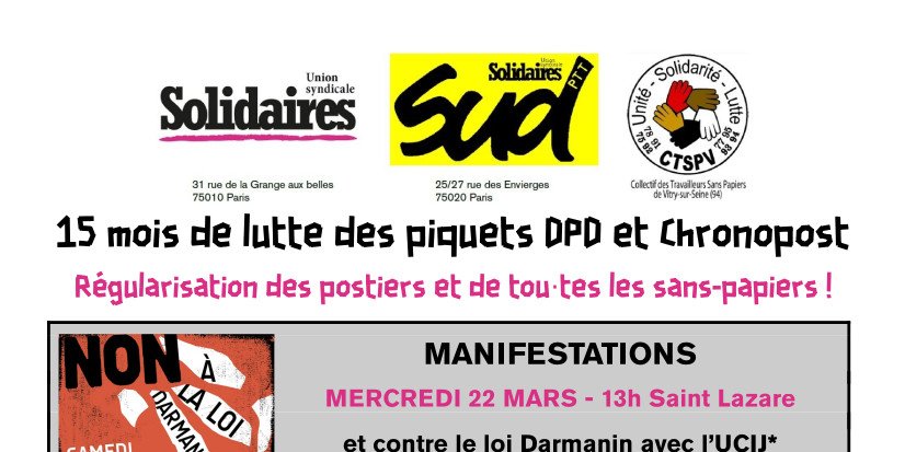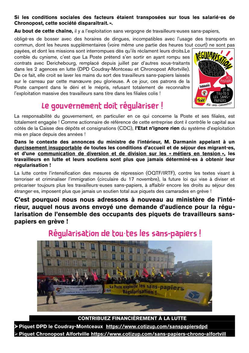 Le ministre de l’intérieur, fin septembre, a reçu une délégation du seul piquet RSI, à l’initiative de Mme Faucillon, députée des Hauts-de-Seine, et 83 occupants de ce piquet ont reçu un récépissé avec autorisation de travail avec la mention « a demandé un premier titre de séjour portant la mention travailleur temporaire ». Cependant, aucune réponse n’a été donnée concernant les piquets des postiers sans-papiers de DPD et Chronopost, aucune réponse alors même que l’Etat est un actionnaire stratégique du donneur d’ordre qu’est La Poste. Malgré plusieurs manifestations et demandes d’audience, le ministère de l’intérieur n’a jamais reçu les représentants des grévistes de DPD et Chronopost, ni leurs soutiens syndicaux !