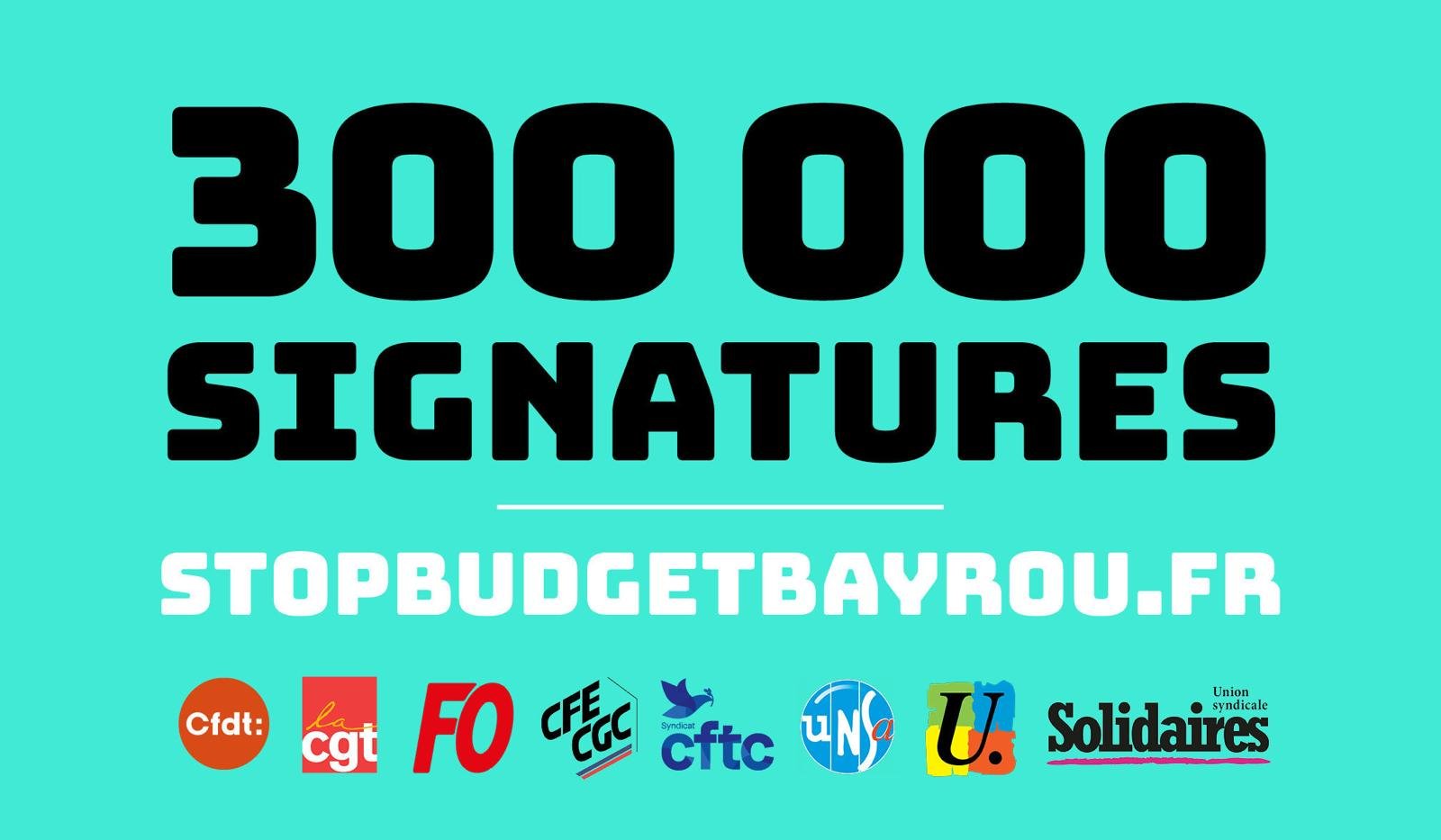 300000 signatures contre le budget Bayrou ! On continue de signer et de faire signer la signature : Budget : les sacrifices pour le monde du travail ça suffit !