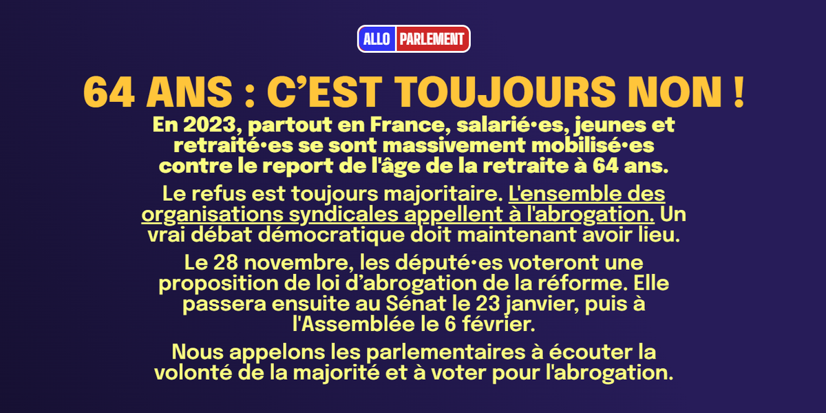 Une plateforme unitaire d'interpellation des député•es sur "64 ans c'est toujours non !" est en ligne. https://alloparlement.fr