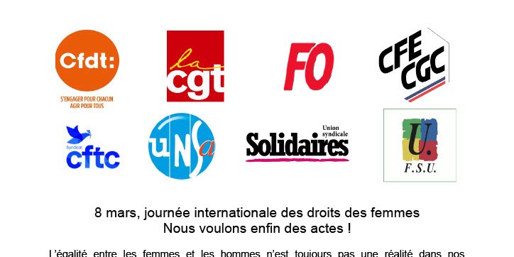 [Communiqué Commun] A l'occasion de la journée internationale pour les droits des femmes, dans un communiqué commun, les huit organisations syndicales de travailleur·ses appellent à agir d'urgence pour l'égalité professionnelle