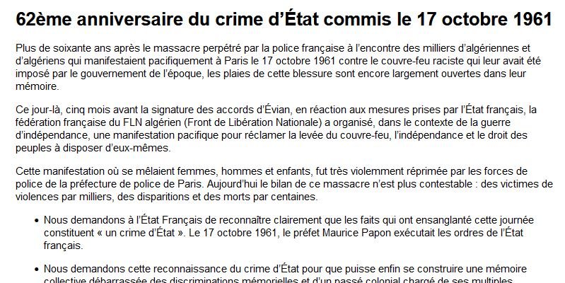 - Nous demandons à l’État Français de reconnaître clairement que les faits qui ont ensanglanté cette journée constituent « un crime d’État ». Le 17 octobre 1961, le préfet Maurice Papon exécutait les ordres de l’État français.