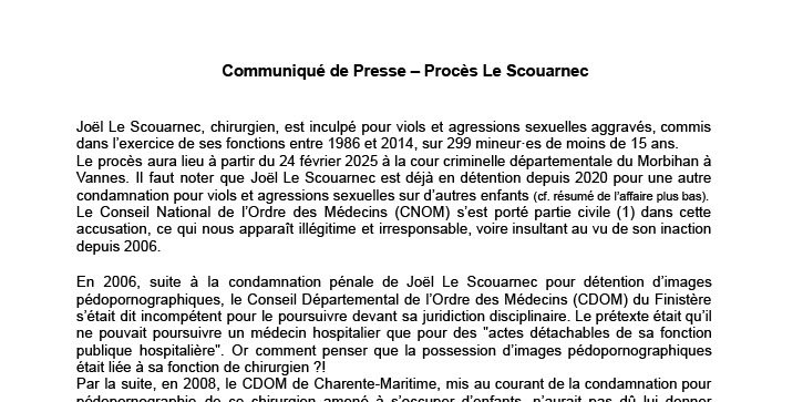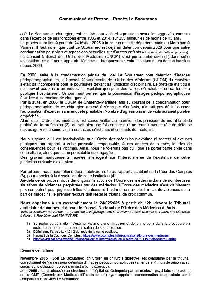 Le procès aura lieu à partir du 24 février 2025 à la cour criminelle départementale du Morbihan à Vannes. Il faut noter que Joël Le Scouarnec est déjà en détention depuis 2020 pour une autre condamnation pour viols et agressions sexuelles sur d’autres enfants (cf. résumé de l’affaire plus bas). Le Conseil National de l’Ordre des Médecins (CNOM) s’est porté partie civile1 dans cette accusation, ce qui nous apparaît illégitime et irresponsable, voire insultant au vu de son inaction depuis 2006.