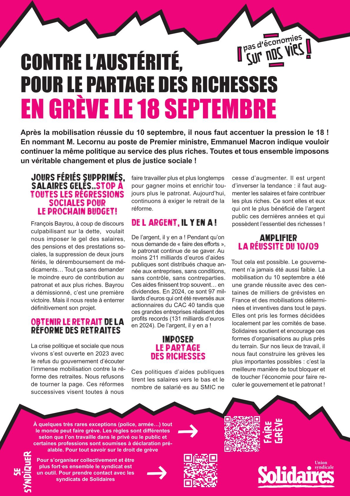 François Bayrou, à coup de discours culpabilisant sur la dette, voulait nous imposer le gel des salaires, des pensions et des prestations sociales, la suppression de deux jours fériés, le déremboursement de médicaments… Tout ça sans demander le moindre euro de contribution au patronat et aux plus riches. Bayrou a démissionné, c’est une première victoire. Mais il nous reste à enterrer définitivement son projet.