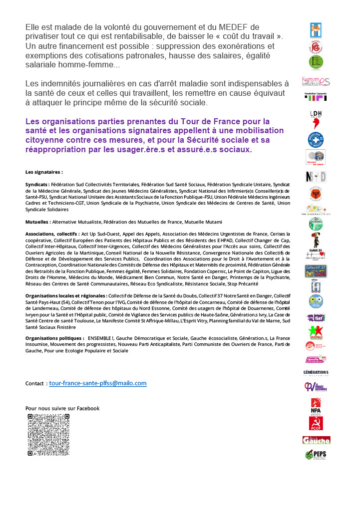 Les organisations parties prenantes du Tour de France pour la santé et les organisations signataires appellent à une mobilisation citoyenne contre ces mesures, et pour la Sécurité sociale et sa réappropriation par les usager.ère.s et assuré.e.s sociaux.