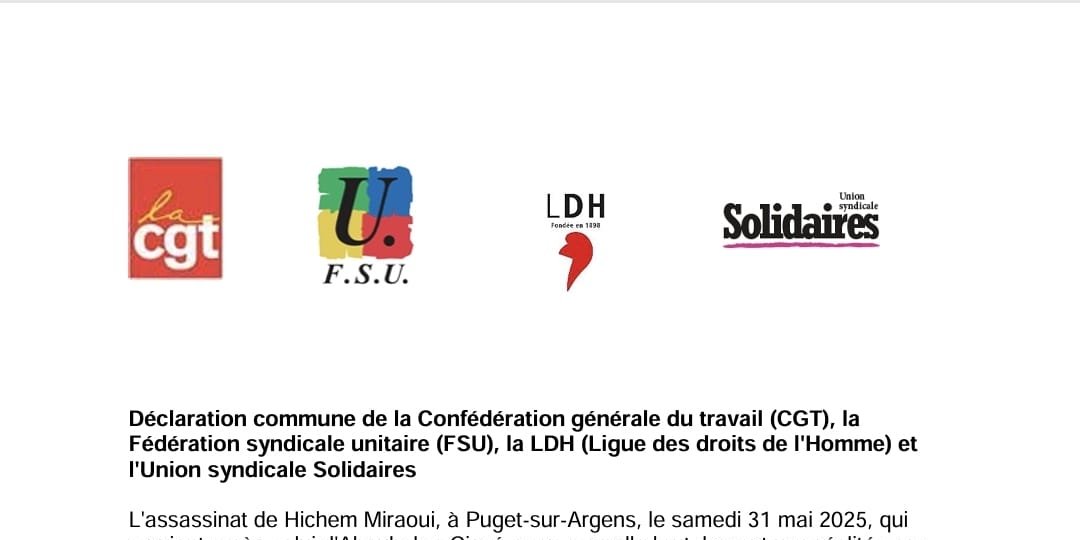 Déclaration commune de la Confédération générale du travail (CGT), la Fédération syndicale unitaire (FSU), la LDH (Ligue des droits de l'Homme) et l'Union syndicale Solidaires