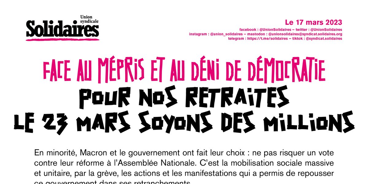 Solidaires, avec l’intersyndicale nationale unitaire et toutes celles et ceux qui se sont déjà mobilisé·es, en particulier par la grève, et le soutien de la majorité de la population, est déterminé à obtenir le retrait de cette loi. L’intersyndicale interprofessionnelle appelle à des rassemblements syndicaux de proximité ce week-end et à faire grève et à manifester jeudi 23 mars.