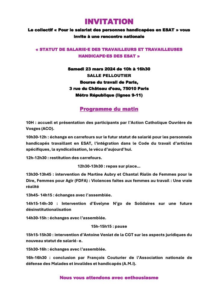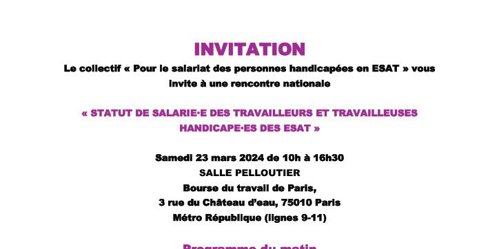 Le collectif « Pour le salariat des personnes handicapées en ESAT » vous invite à une rencontre nationale « Statut de salarié∙e des travailleurs et travailleuses handicapé∙es des ESAT »