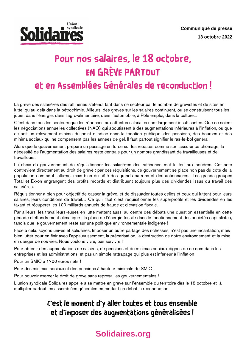 Face à cela, soyons uni-es et solidaires. Imposer un autre partage des richesses, n’est pas une incantation, mais bien lutter pour en finir avec l’appauvrissement, la précarisation, la destruction de notre environnement et la mise en danger de nos vies.