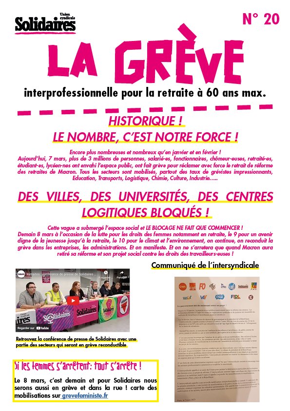 Demain 8 mars à l’occasion de la lutte pour les droits des femmes notamment en retraite, le 9 pour un avenir digne de la jeunesse jusqu’à la retraite, le 10 pour le climat et l’environnement, on continue, on reconduit la grève dans les entreprises, les administrations. Et on manifeste. Et on ne s’arretera que quand Macron aura retiré sa réforme et son projet social contre les droits des travailleurs-euses !