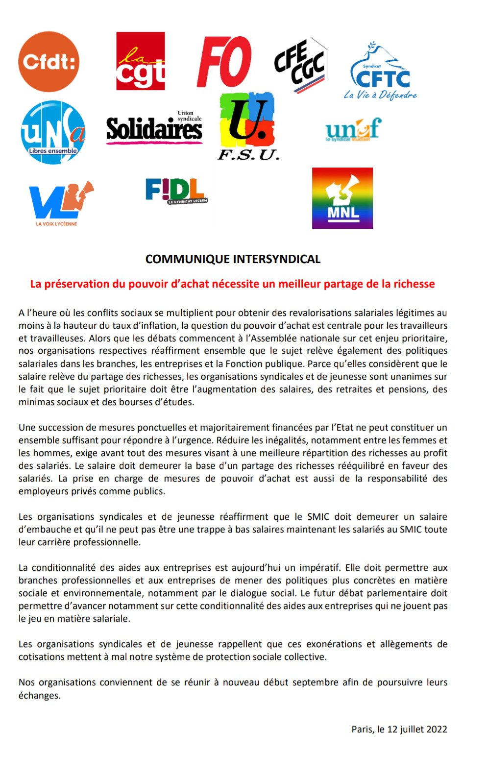 A l’heure où les conflits sociaux se multiplient pour obtenir des revalorisations salariales légitimes au moins à la hauteur du taux d’inflation, la question du pouvoir d’achat est centrale pour les travailleurs et travailleuses. Alors que les débats commencent à l’Assemblée nationale sur cet enjeu prioritaire, nos organisations respectives réaffirment ensemble que le sujet relève également des politiques salariales dans les branches, les entreprises et la Fonction publique. Parce qu’elles considèrent que le salaire relève du partage des richesses, les organisations syndicales et de jeunesse sont unanimes sur le fait que le sujet prioritaire doit être l’augmentation des salaires, des retraites et pensions, des minimas sociaux et des bourses d’études.