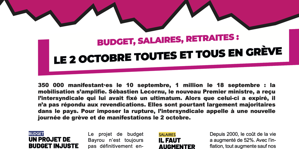 350 000 manifestant·es le 10 septembre, 1 million le 18 septembre : la mobilisation s’amplifie. Sébastien Lecornu, le nouveau Premier ministre, a reçu l’intersyndicale qui lui avait fixé un ultimatum. Alors que celui-ci a expiré, il n’a pas répondu aux revendications. Elles sont pourtant largement majoritaires dans le pays. Pour imposer la rupture, l’intersyndicale appelle à une nouvelle journée de grève et de manifestations le 2 octobre.