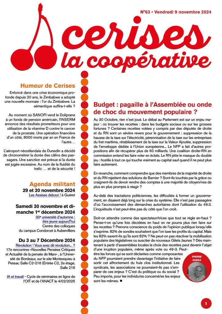 Plusieurs articles de camarades de Solidaires, dans le cadre du dossier "Femmes en lutte ; hier, aujourd'hui, demain" et/ou de l'international dans ce numéro à lire en ligne ici Cerises N°63 NOVEMBRE 2024 ou dans le PDF en PJ.