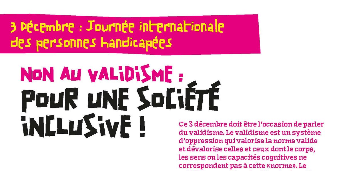 Ce 3 décembre doit être l'occasion de parler du validisme. Le validisme est un système d'oppression qui valorise la norme valide et dévalorise celles et ceux dont le corps, les sens ou les capacités cognitives ne correspondent pas à cette "norme". Le validisme organise ainsi l'exclusion et la maltraitance des personnes en situation de handicap.
