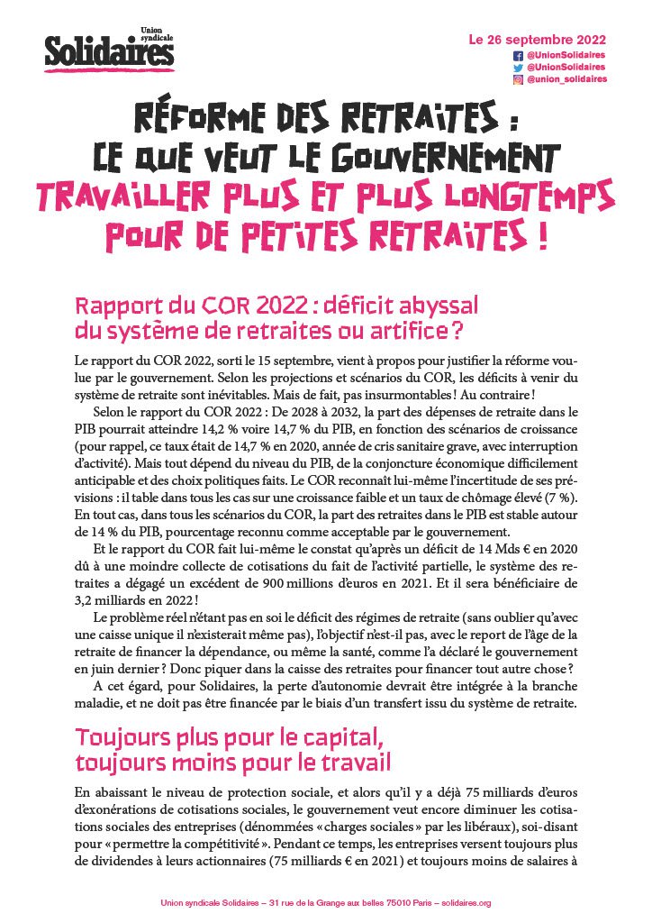Pour Solidaires les 75 milliards d’euros d’exonérations de cotisations sociales doivent être remises en cause, et une cotisation sociale sur les dividendes devrait être mise en place. Solidaires exige également l’égalité salariale femmes/hommes et une hausse de la cotisation sociale patronale (un point suffirait !) : elles sont nombreuses les solutions escamotées par le gouvernement !