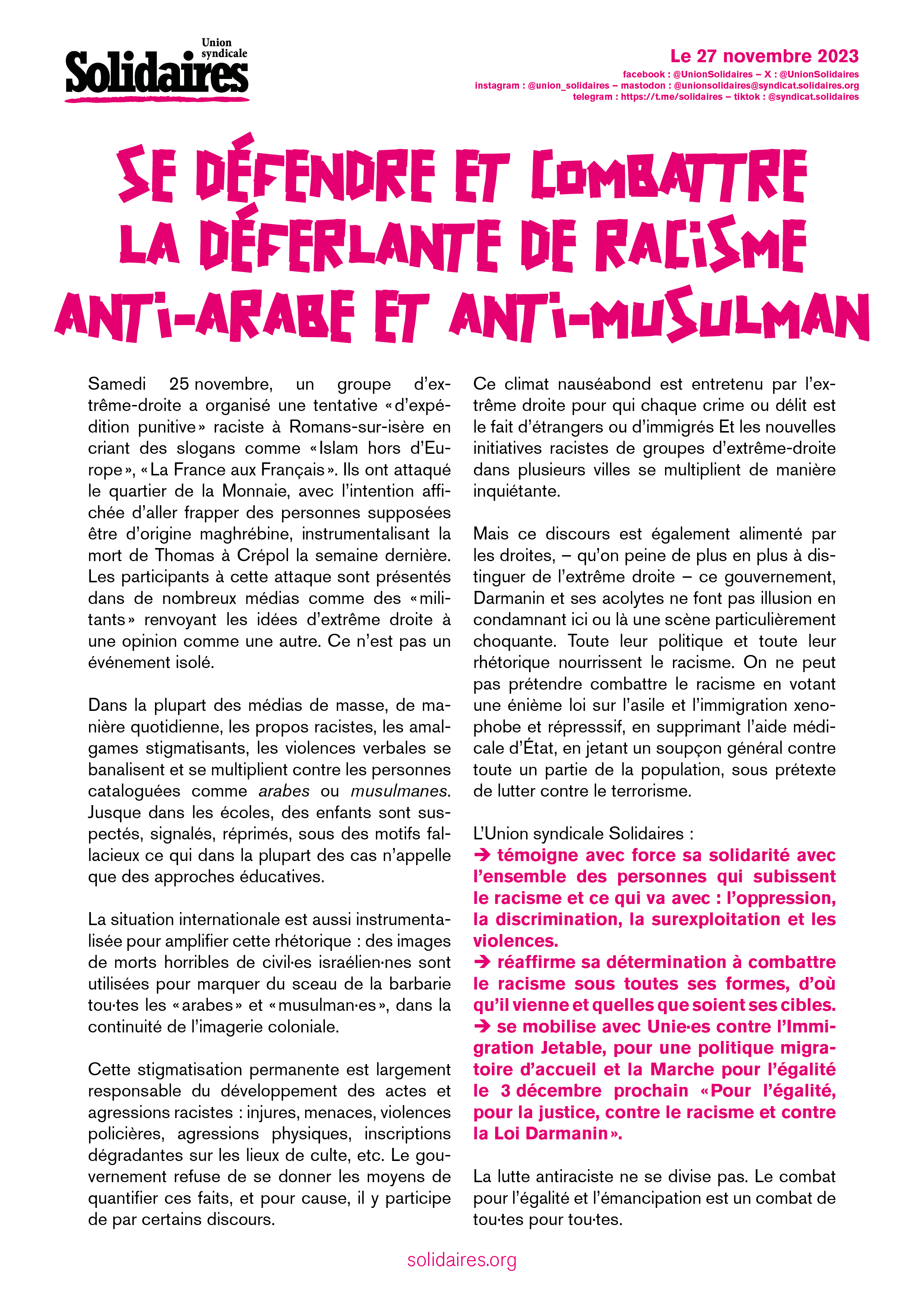Samedi 25 novembre, un groupe d’extrême-droite a organisé une tentative « d’expédition punitive » raciste à Romans-sur-isère en criant des slogans comme « Islam hors d’Europe », « La France aux Français ». Ils ont attaqué le quartier de la Monnaie, avec l’intention affichée d’aller frapper des personnes supposées être d’origine maghrébine, instrumentalisant la mort de Thomas à Crépol la semaine dernière. Les participants à cette attaque sont présentés dans de nombreux médias comme des « militants » renvoyant les idées d’extrême droite à une opinion comme une autre. Ce n’est pas un événement isolé.