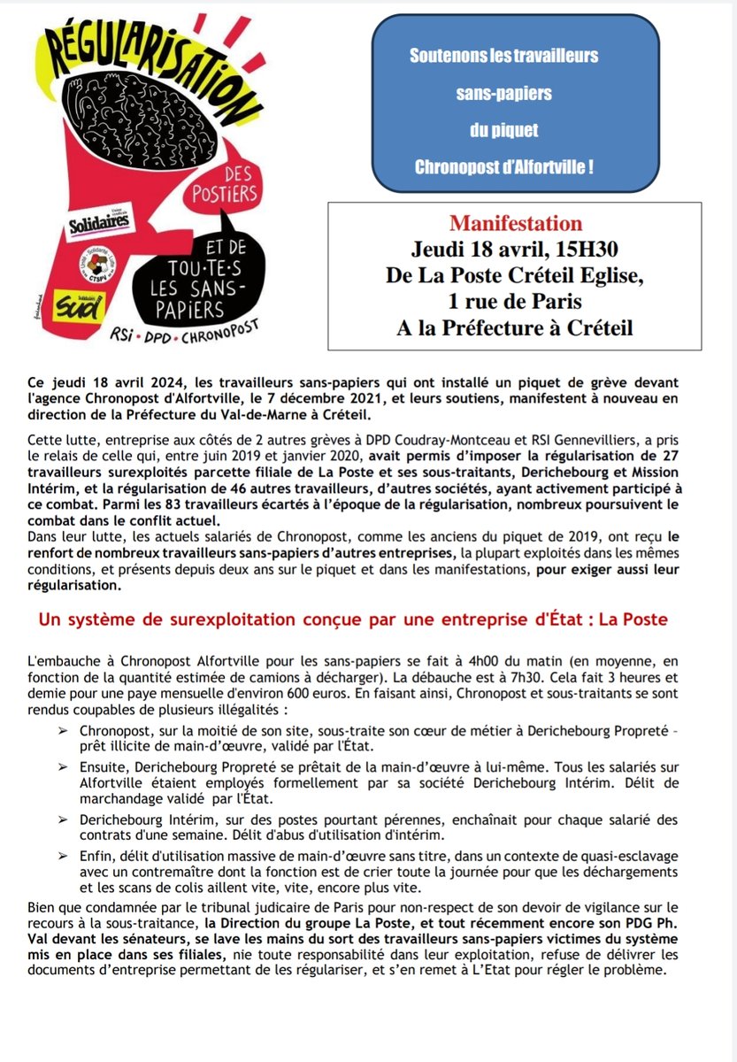 Soutenons les camarades sans papiers du piquet Chronopost d'Alfortville - mobilisation le 18 avril