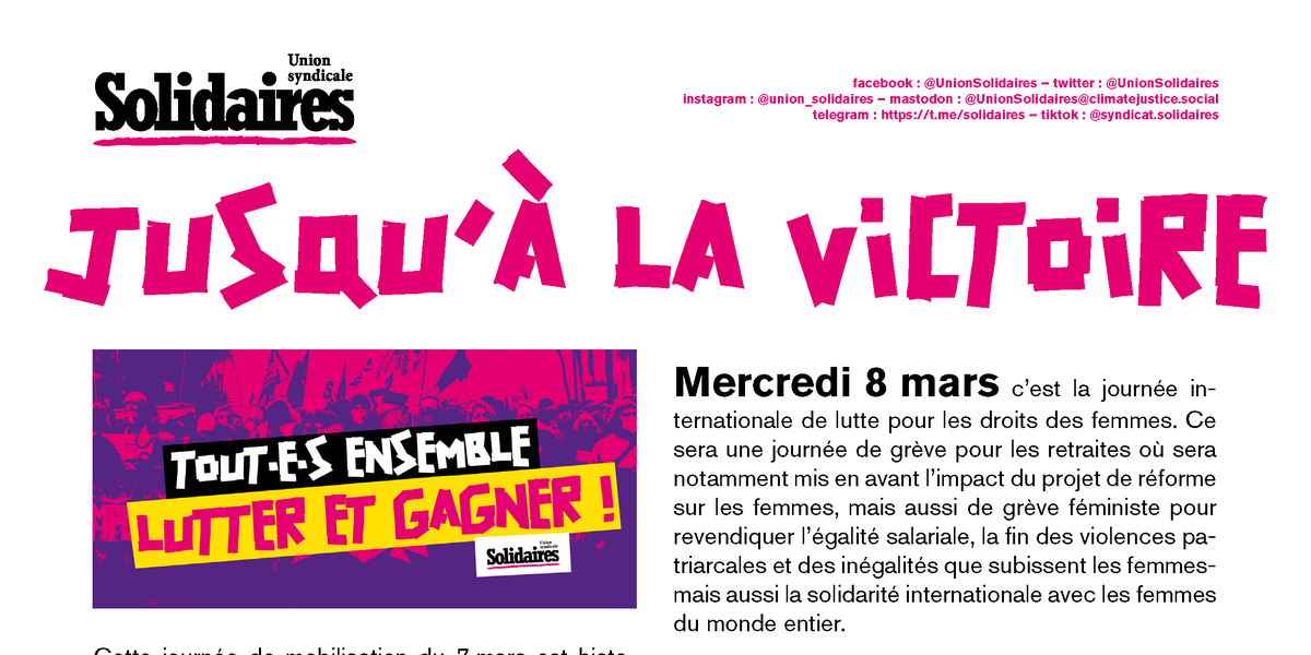 Se syndiquer Solidaires, c’est rejoindre un outil construit par des travailleuses et des travailleurs pour notre défense au quotidien mais aussi pour gagner de nouveaux droits. Solidaires est écologiste, féministe, antiraciste, LGBT+, antifasciste, anticapitaliste et internationaliste. Nous cherchons à avoir des pratiques démocratiques et nous sommes indépendants des patrons et des hiérarchies. Pour entrer en contact avec nos syndicats et nos solidaires départementaux : https://solidaires.org/