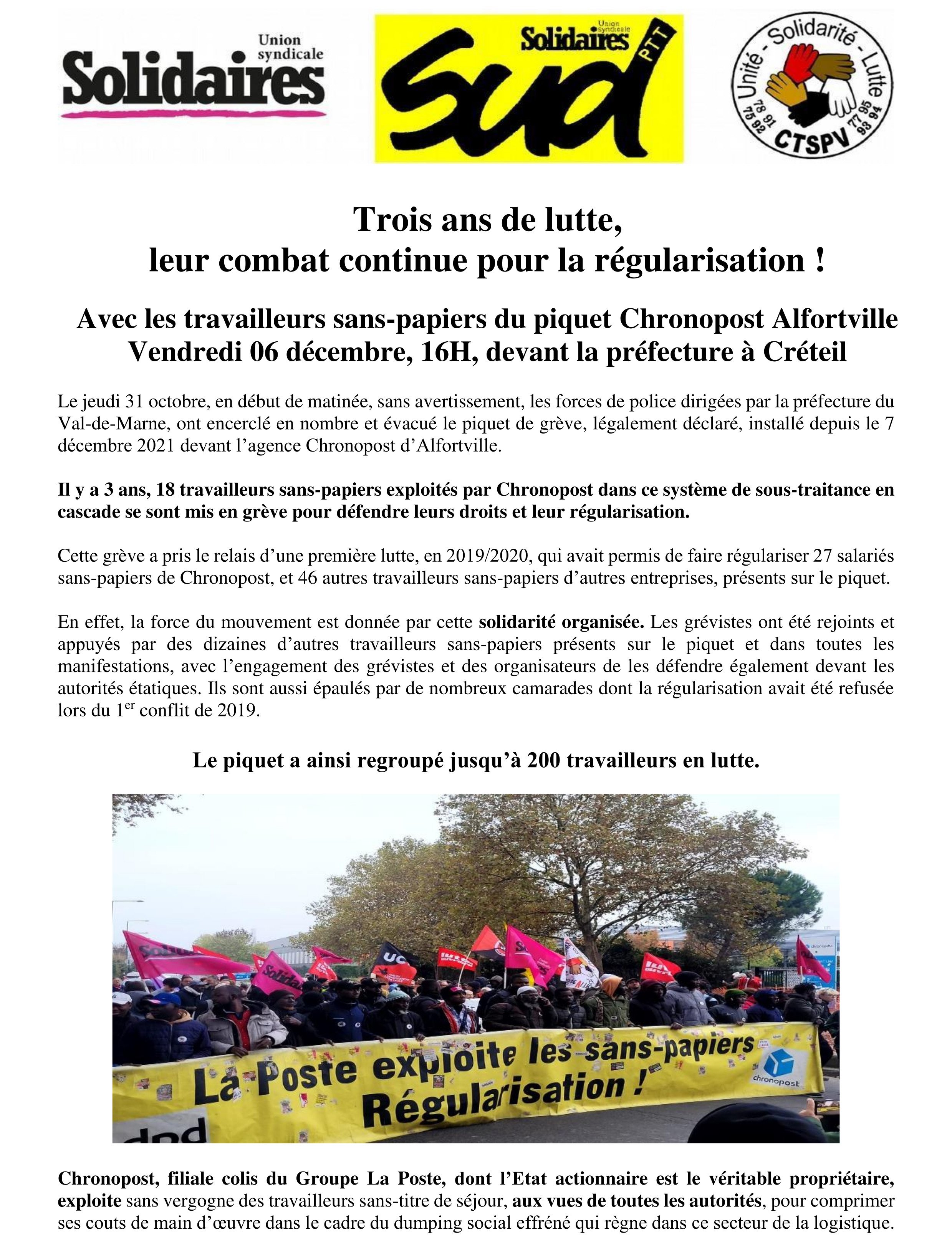 Les occupants expulsés du piquet Chronopost d’Alfortville seront à nouveau vendredi 06 décembre devant la préfecture à Créteil.