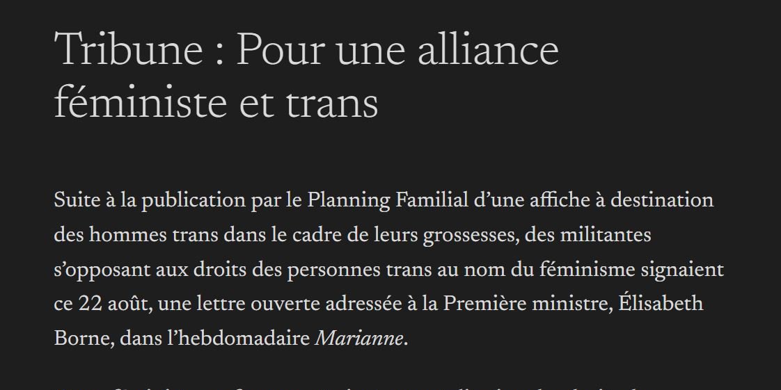 Suite à la publication par le Planning Familial d’une affiche à destination des hommes trans dans le cadre de leurs grossesses, des militantes s’opposant aux droits des personnes trans au nom du féminisme signaient ce 22 août, une lettre ouverte adressée à la Première ministre, Élisabeth Borne, dans l’hebdomadaire Marianne.