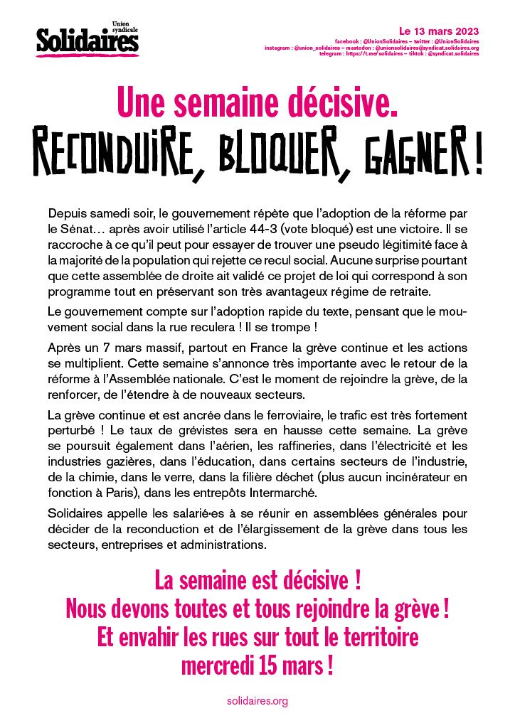 La semaine est décisive ! Nous devons toutes et tous rejoindre la grève ! Et envahir les rues sur tout le territoire mercredi 15 mars !