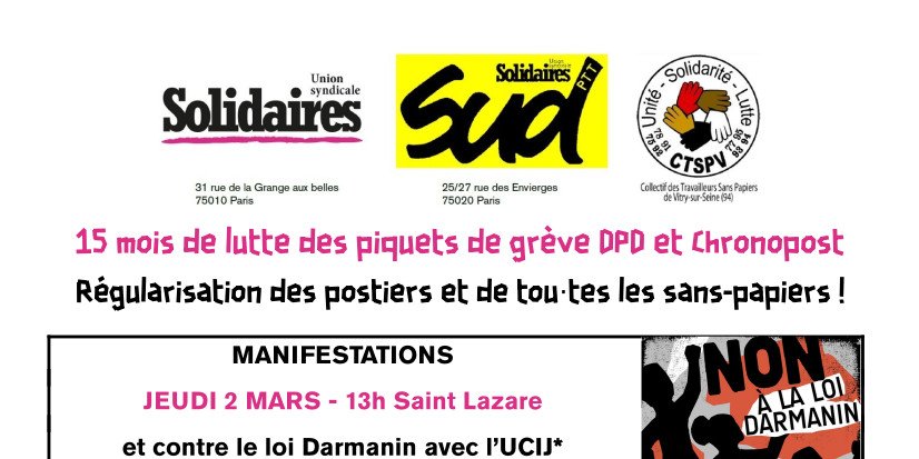 15 mois de lutte des piquets de grève DPD et Chronopost . Régularisation des postiers et de tou⋅tes les sans-papiers !