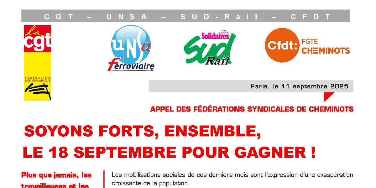 La CGT Cheminots, l’UNSA-Ferroviaire, SUD-Rail et la CFDT Cheminots appellent l’ensemble des cheminotes et les cheminots, de tous métiers et toutes fonctions, à agir par la grève et participer aux initiatives interprofessionnelles le 18 septembre prochain.